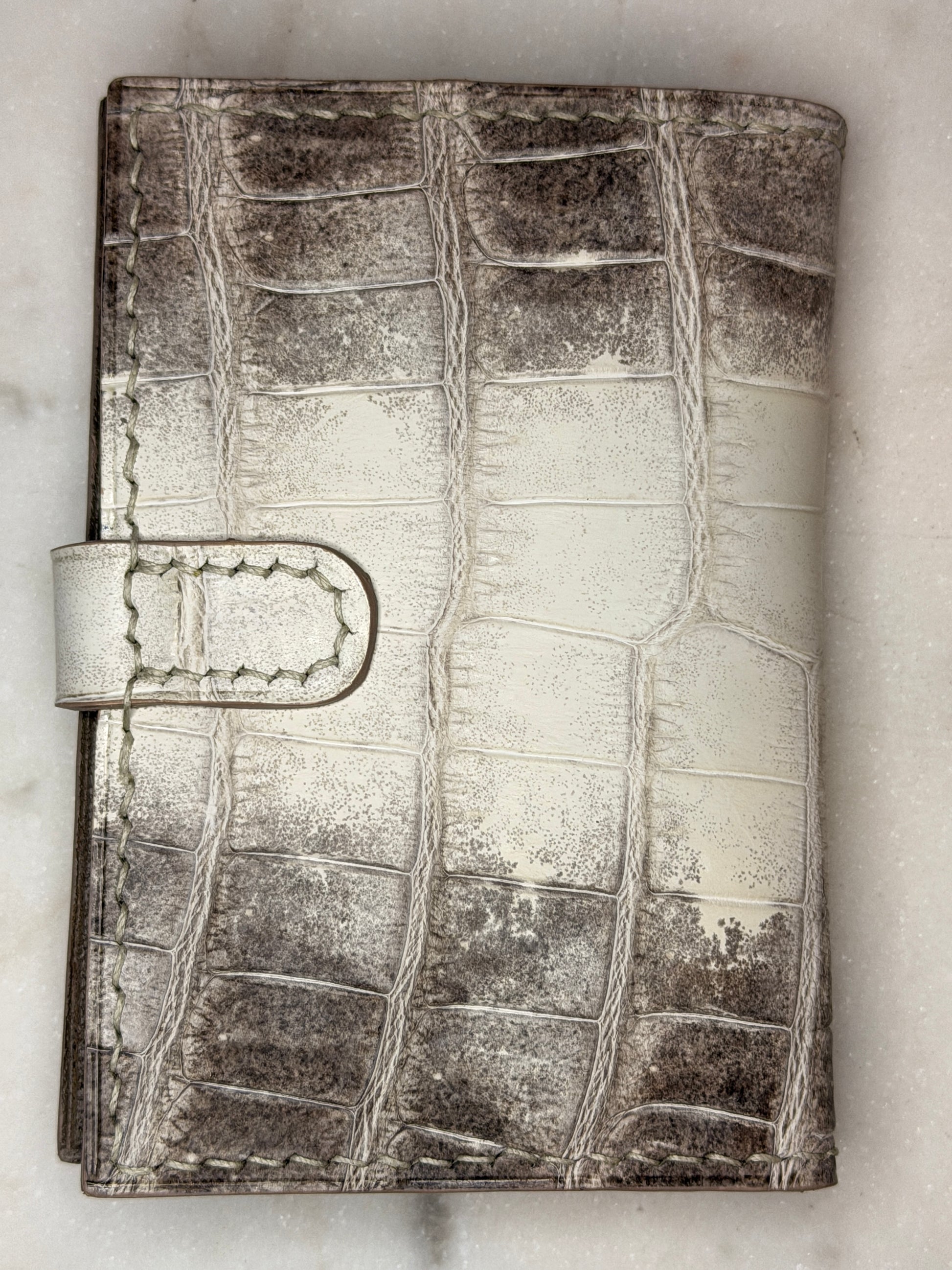 Bifold cardholder Arya , 6 pockets in Himalaya matte crocodile with taupe goat skin lining, handmade and hand stitch with light grey linen thread.