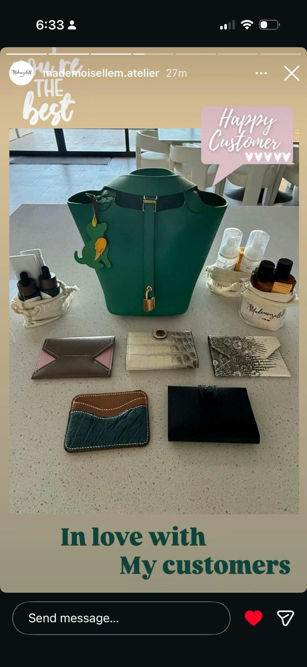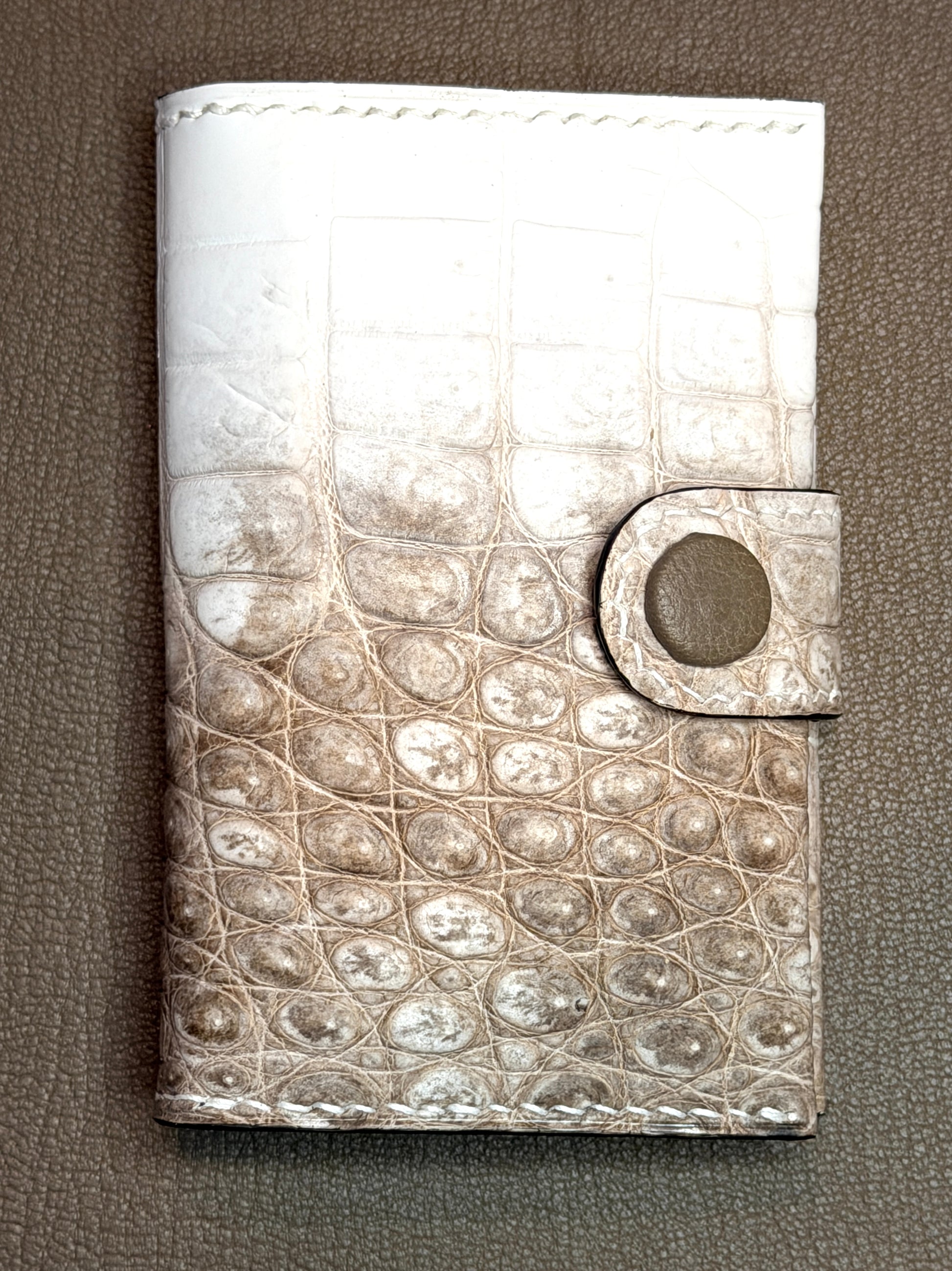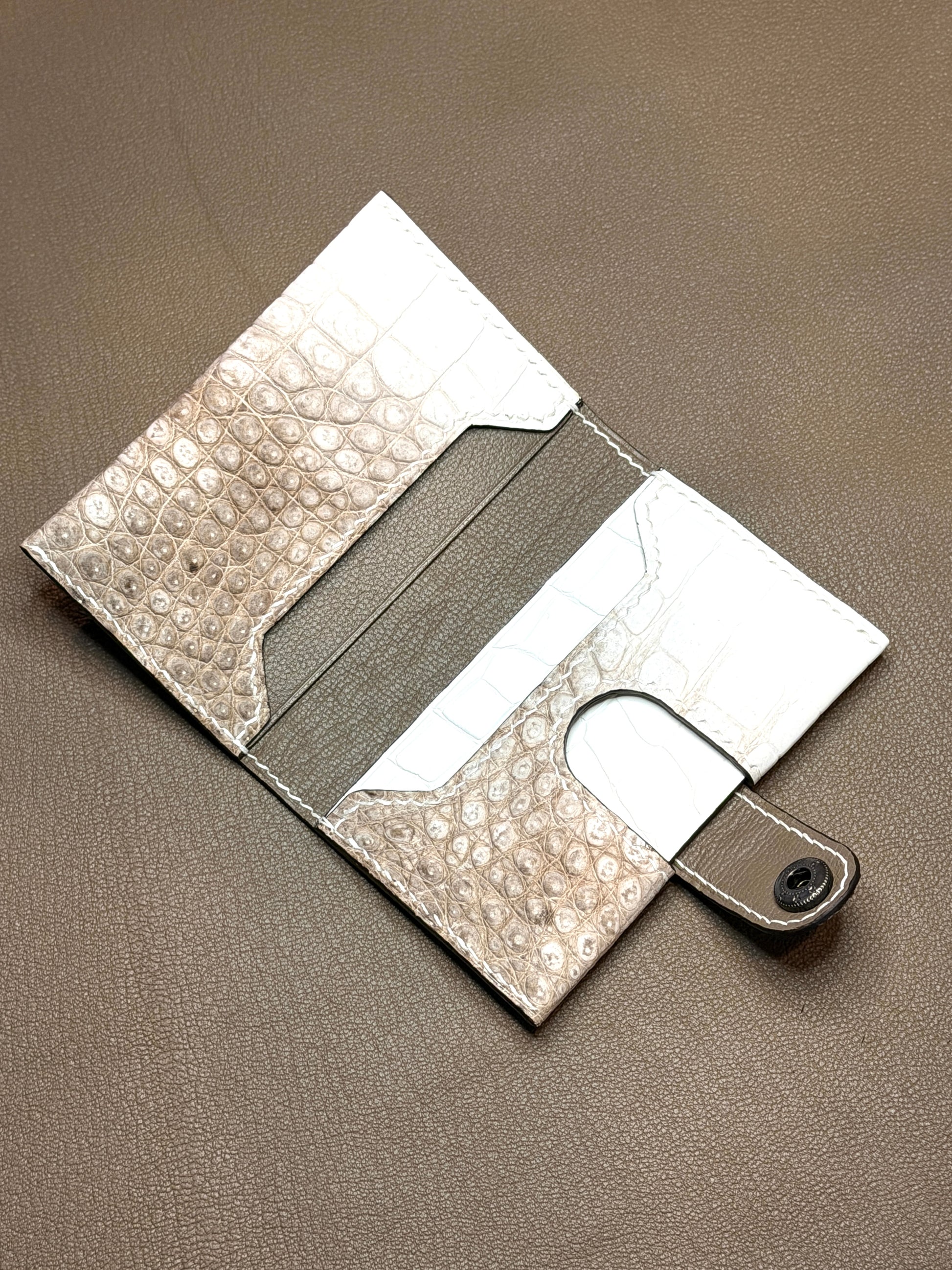 Bifold Icare cardholder crocodile matte Himalaya with double pockets Etoupe goat skin and white matte Himalaya crocodile skin, covered in toile goat skin button, handmade and hand stitch with white linen thread.