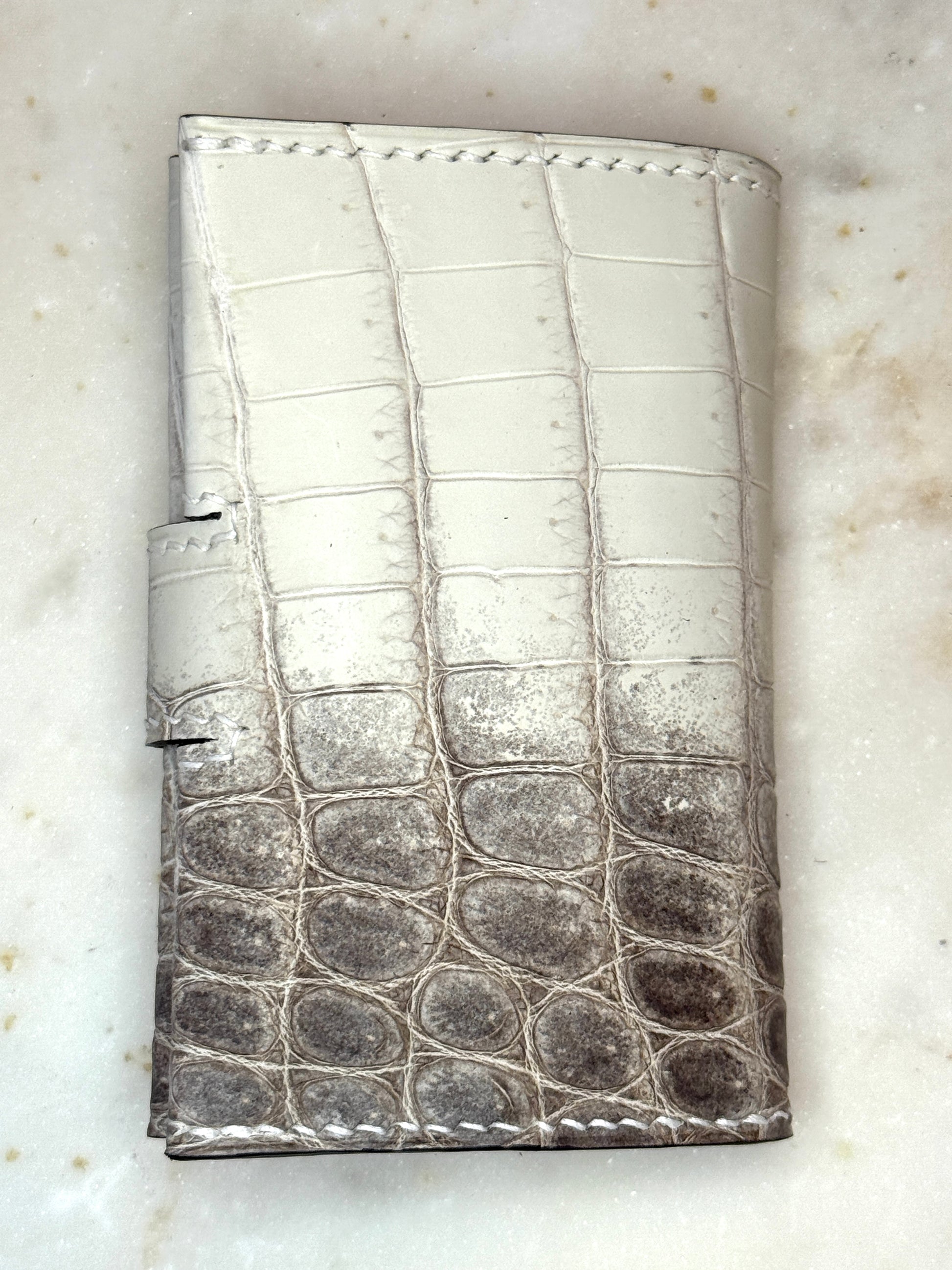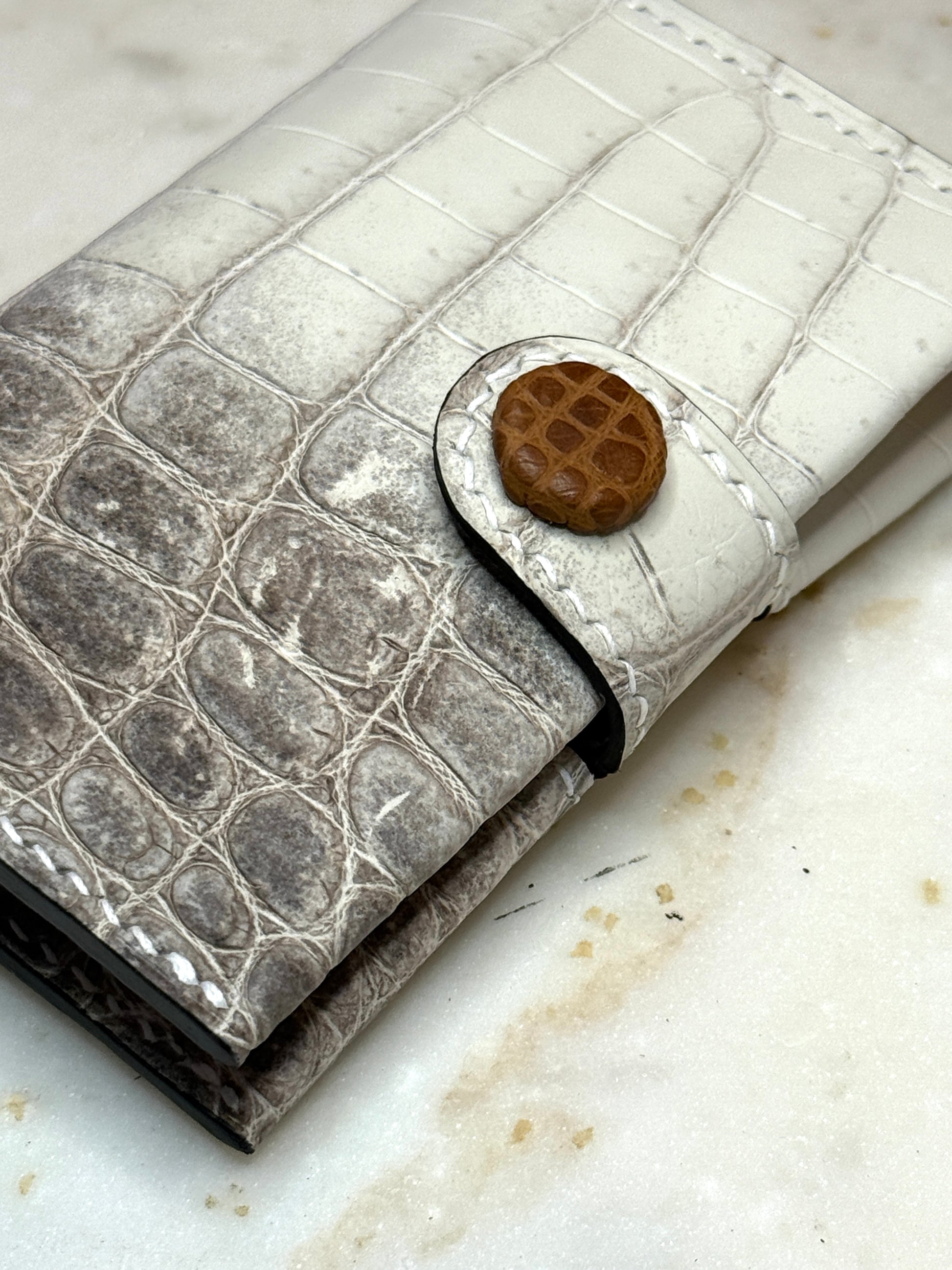 Bifold cardholder crocodile matte Himalaya with grey and dark blue goat skin lining, covered brown matte crocodile button, handmade and hand stitch with linen thread.