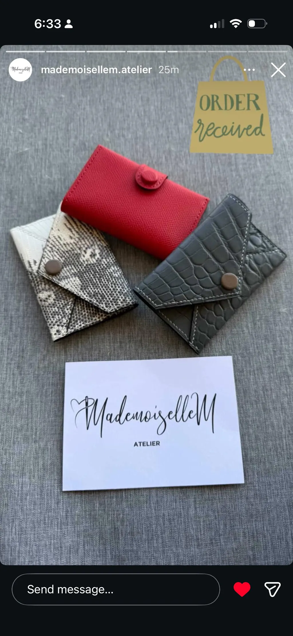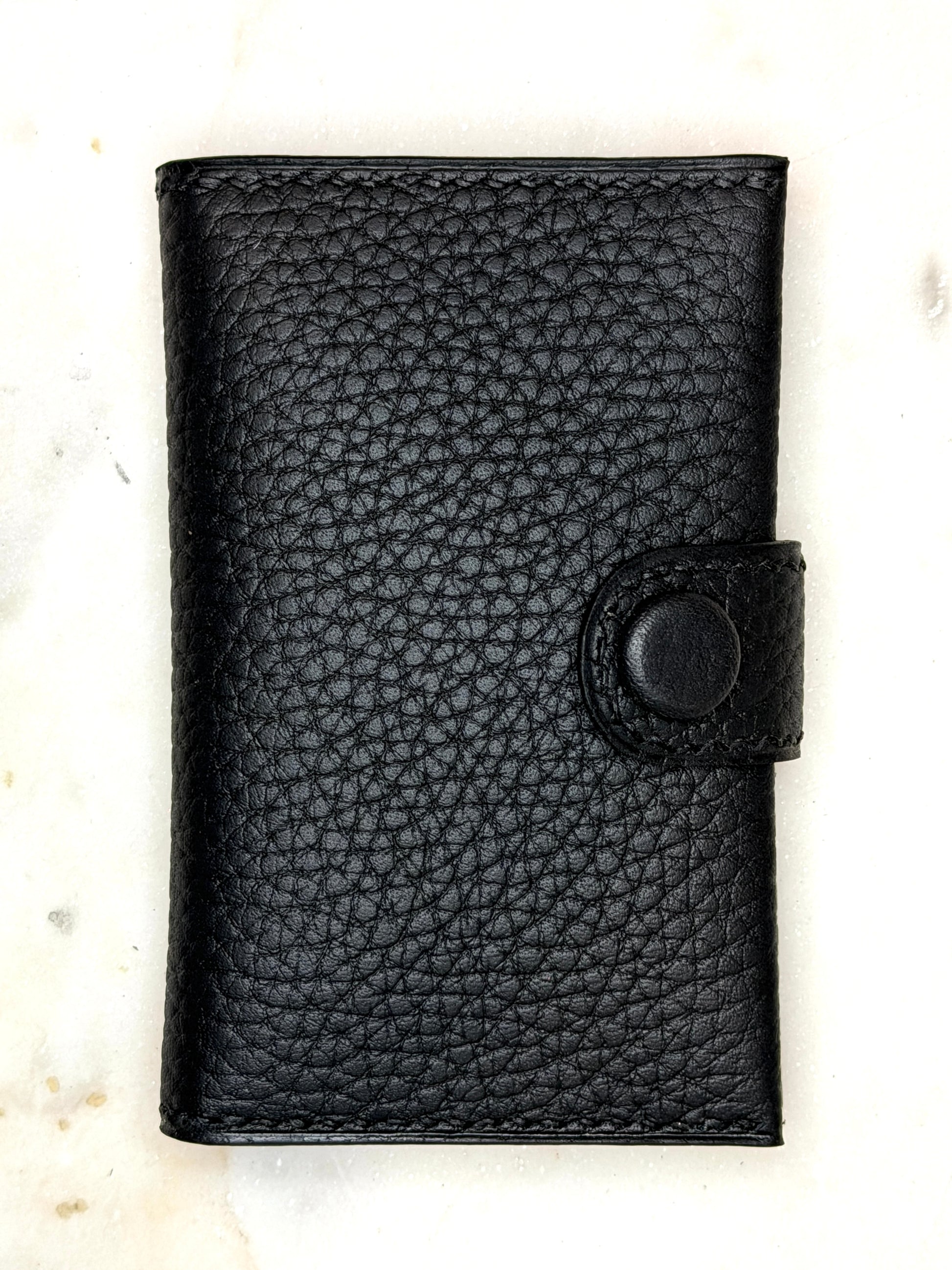 Bifold cardholder Icare Togo noir with Etoupe chèvre leather linen, handmade and hand stitch with black linen thread.