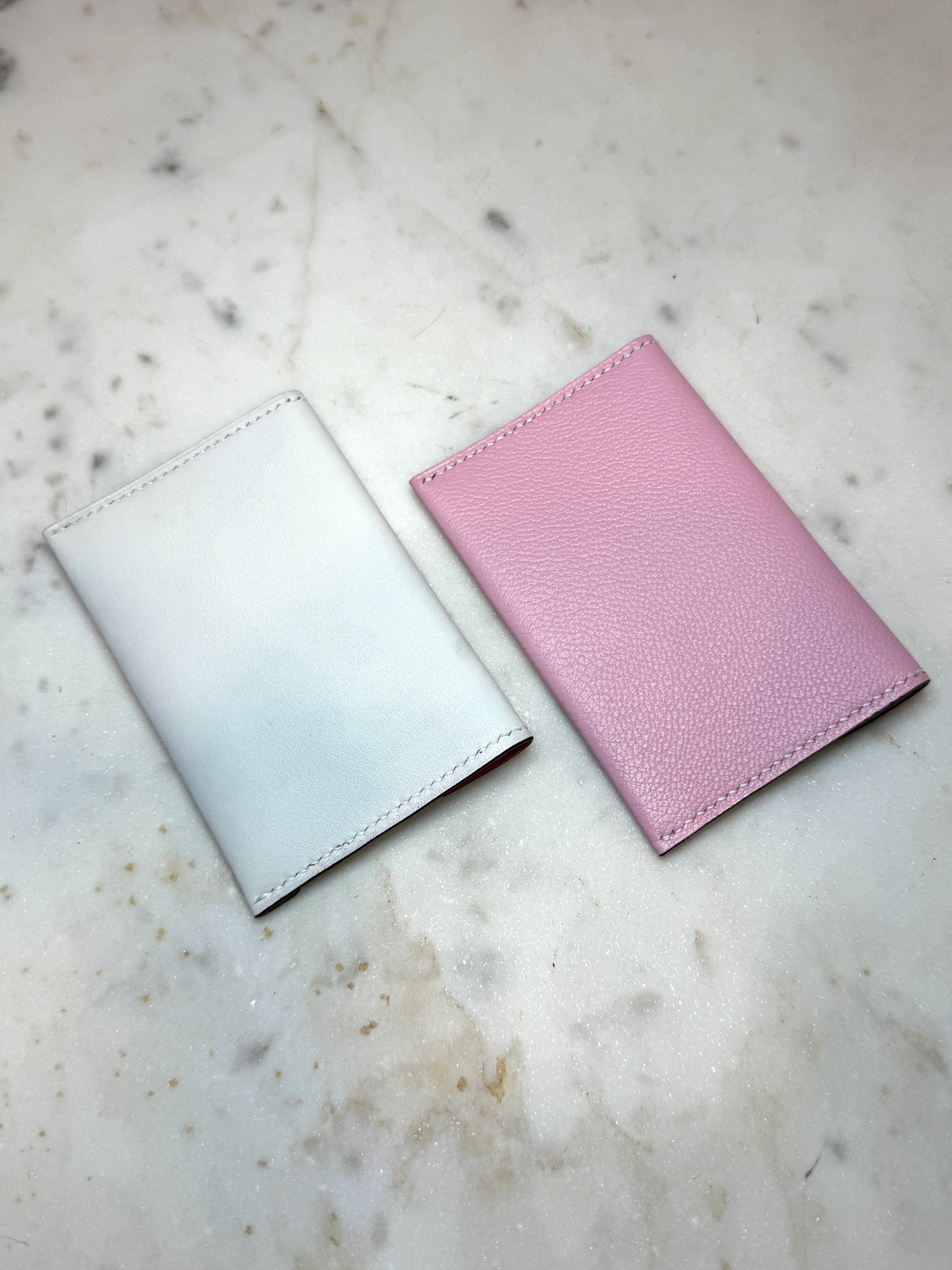 Enveloppe cardholder in ombre lizard, white calfskin and pink goat skin, handmade and hand stitch with linen thread.