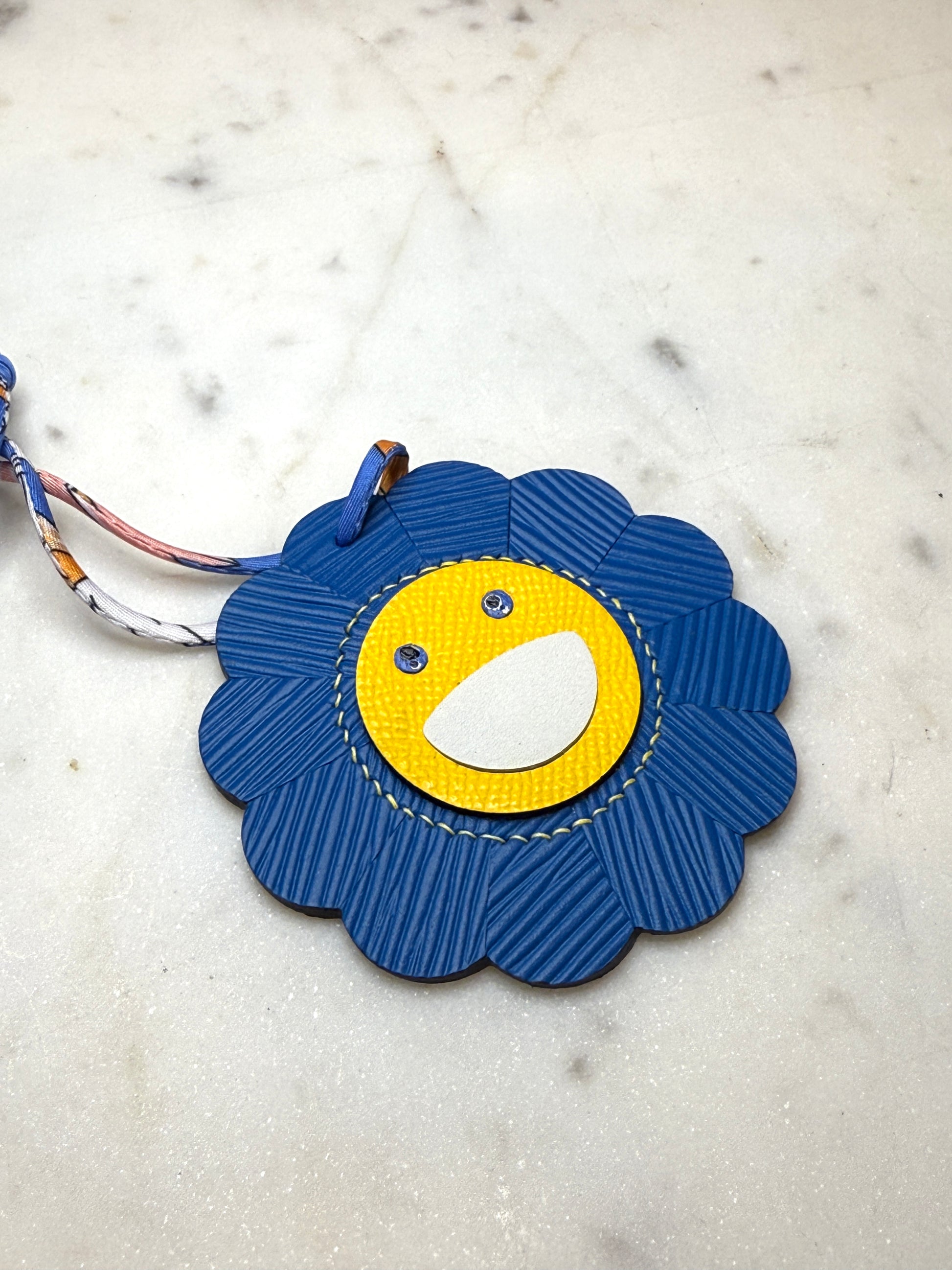Flower bag charms in blue cowhide and yellow stiff calfskin leather, handmade and hand stitch with linen thread and silk cord.