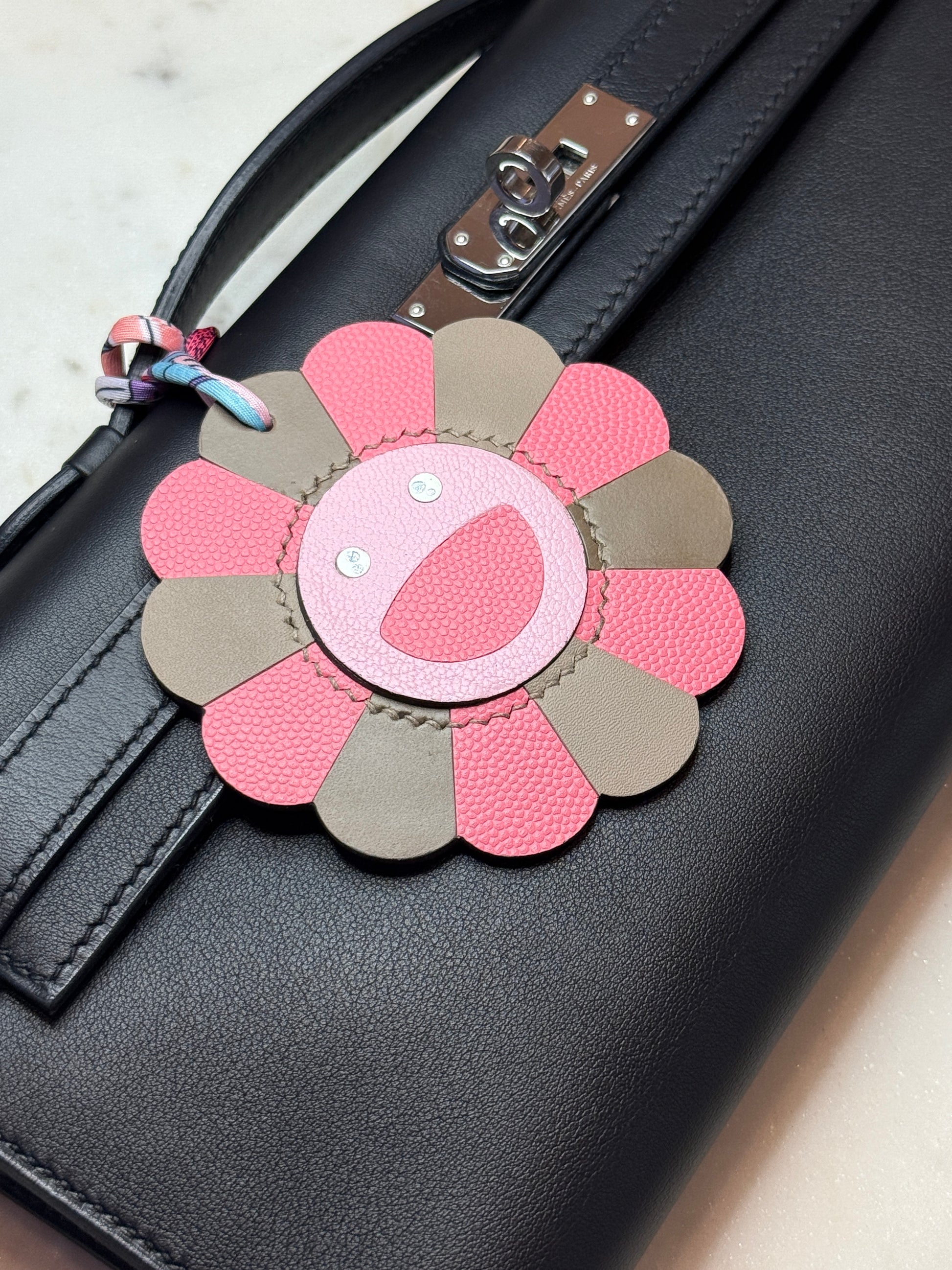 Flower bag charms in taupe and pink calfskin and goat skin, handmade and hand stitch with linen thread and silk cord.