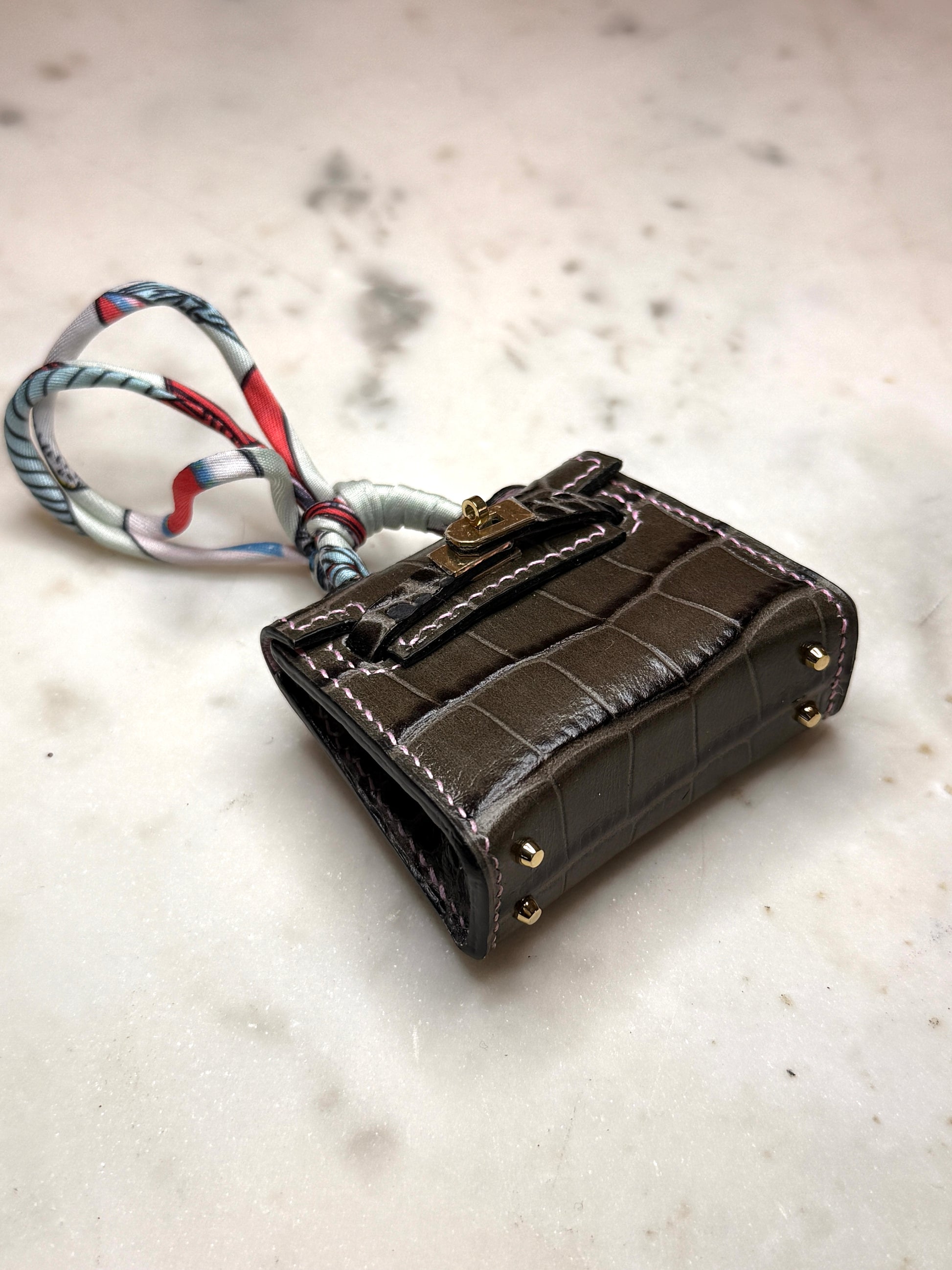 M bag charm, embossed crocodile , handmade and hand stitch with pink linen thread, multicolour silk cord.