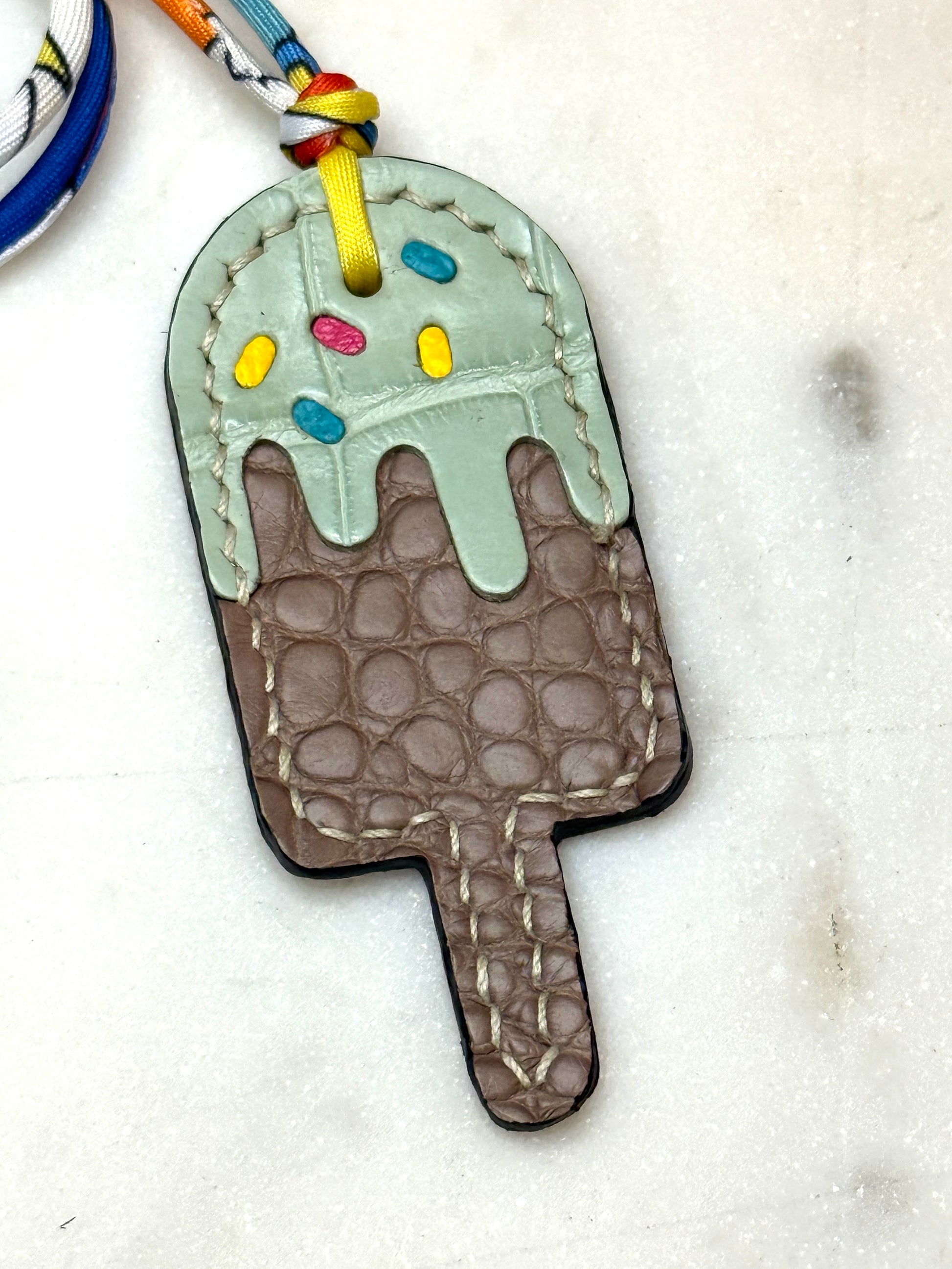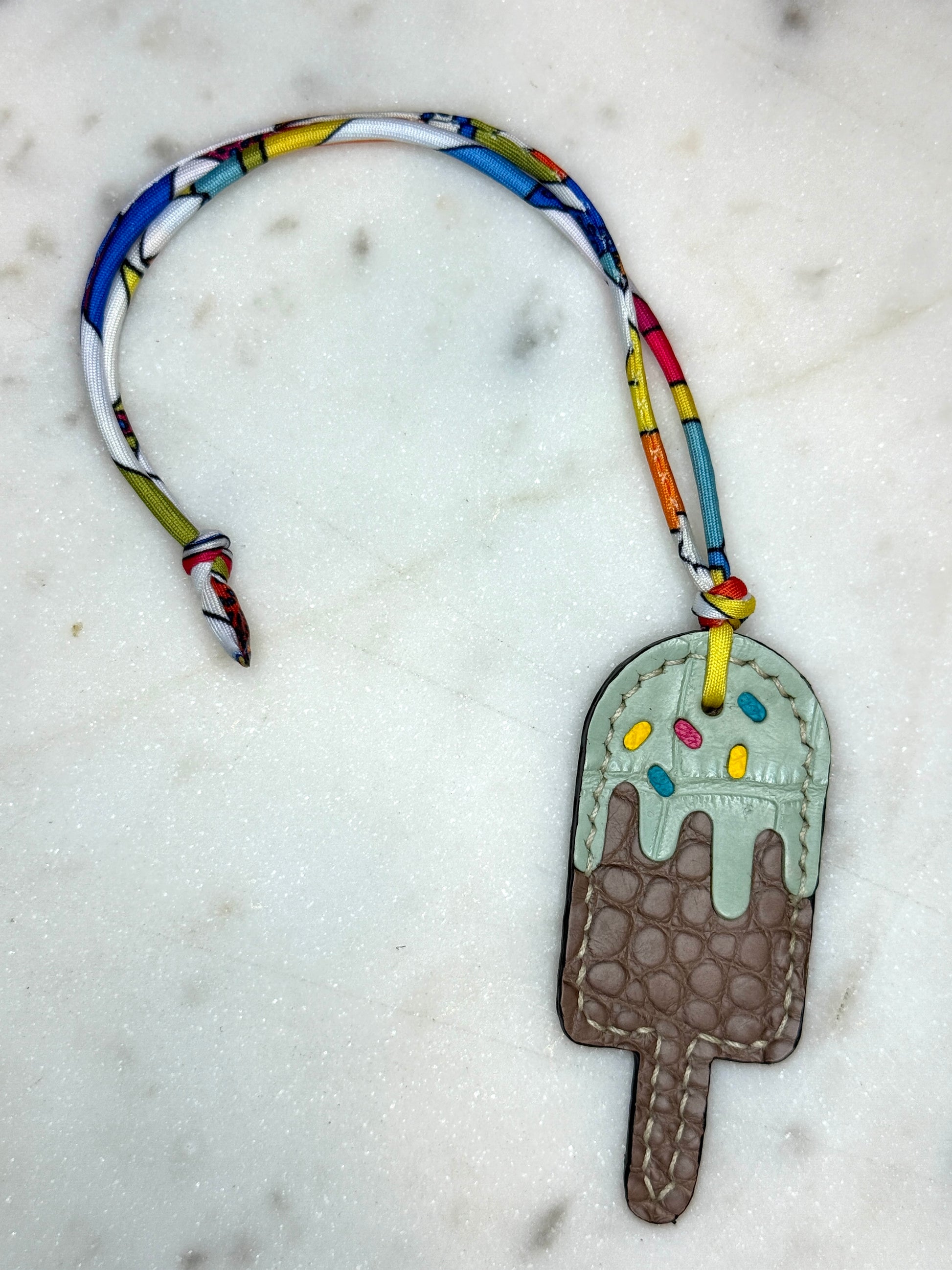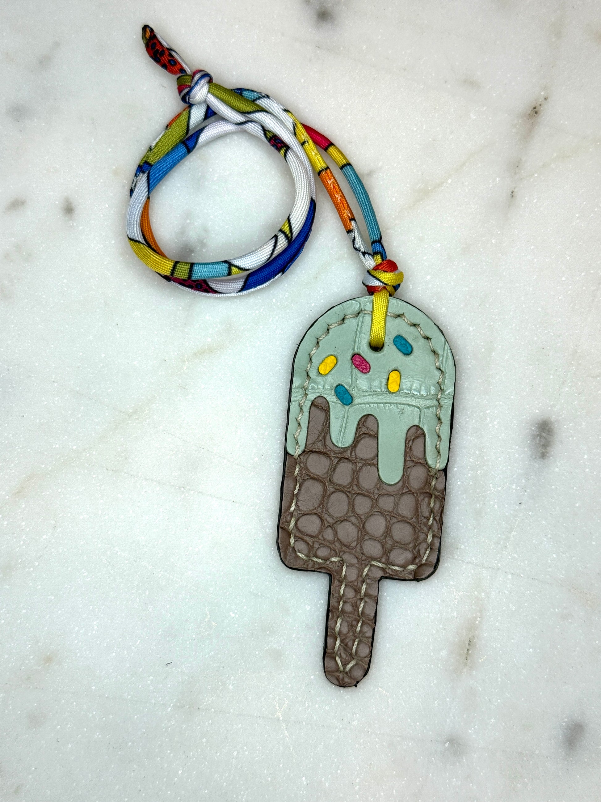 Popsicles bag charms in mint and taupe matte crocodile, handmade and hand stitch with linen thread and silk cord.