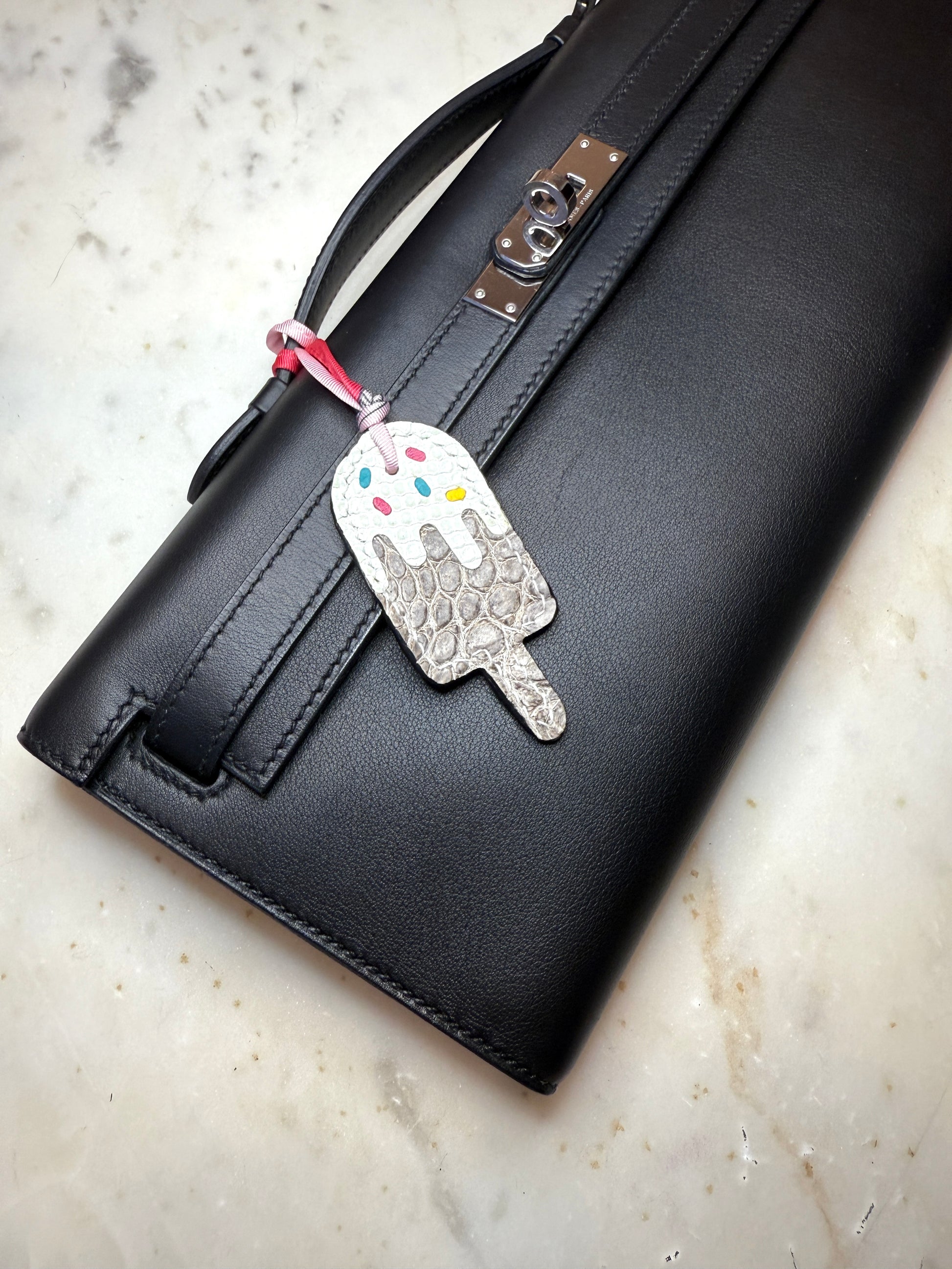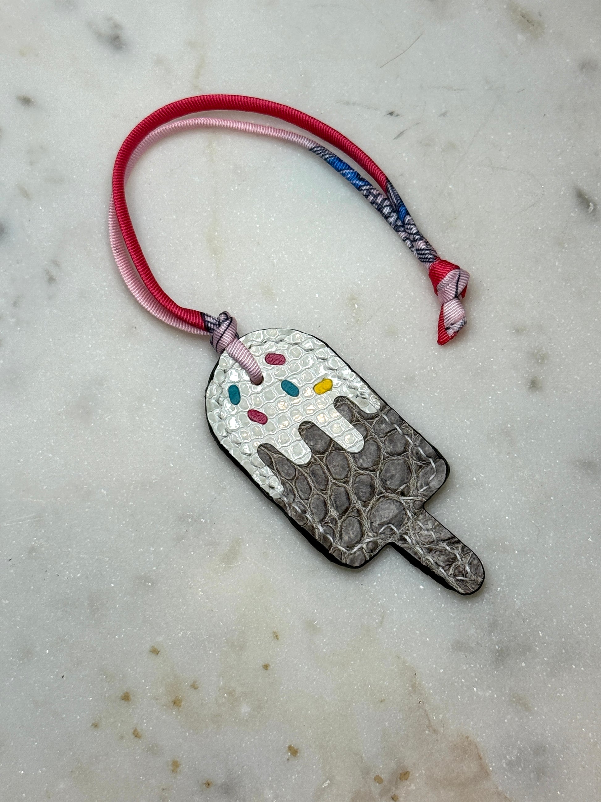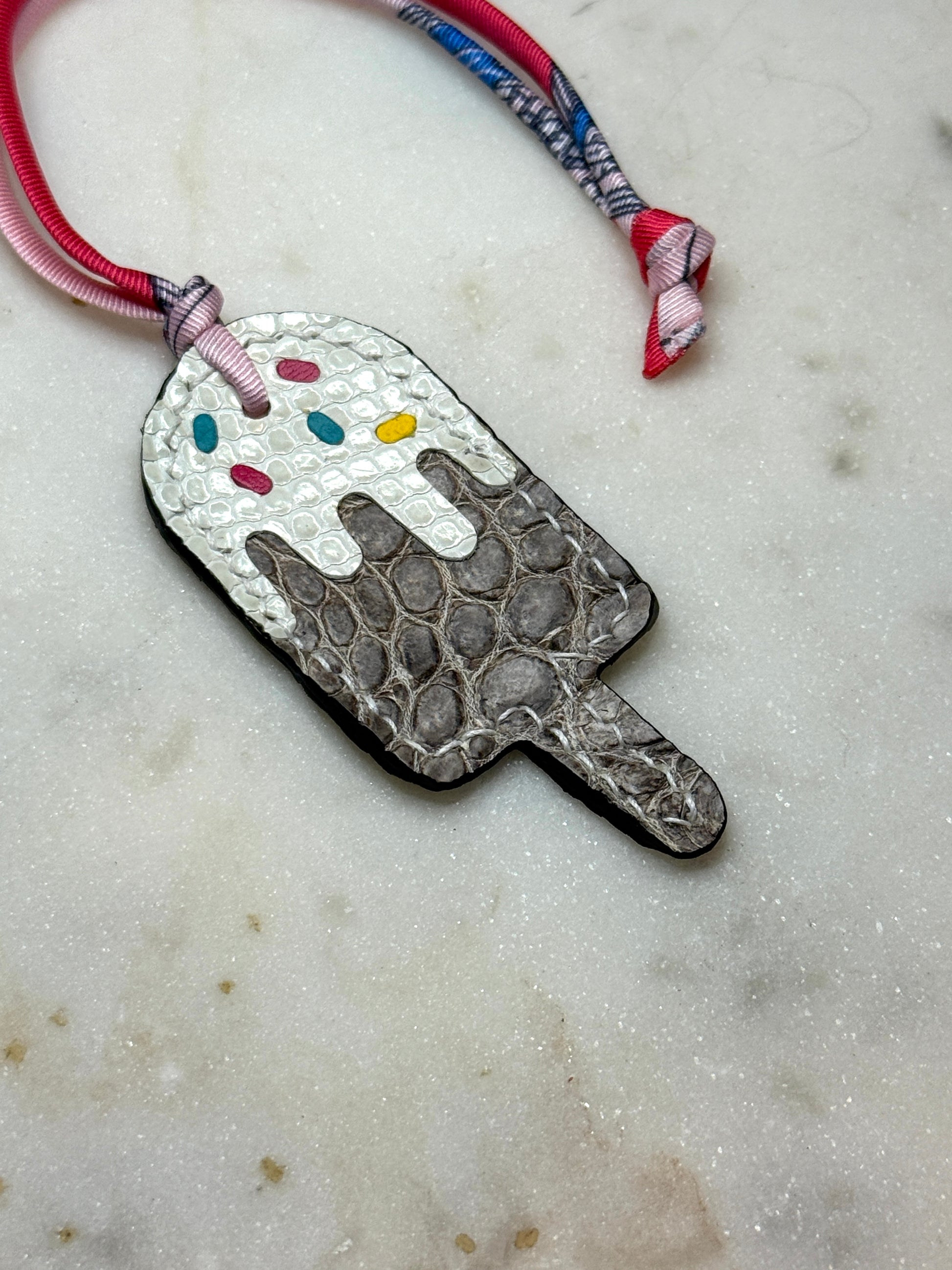 Popsicles bag charms in crocodile Himalaya and white lizard, handmade and hand stitch with linen thread and silk cord