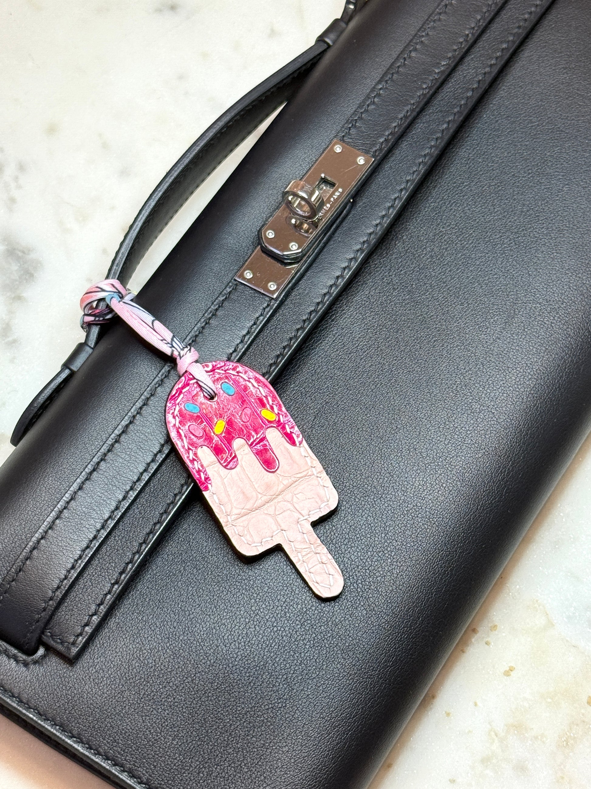 Popsicles bag charms in matte crocodile rose Sakura and shinny crocodile fuchsia, handmade and hand stitch with linen thread and silk cord.